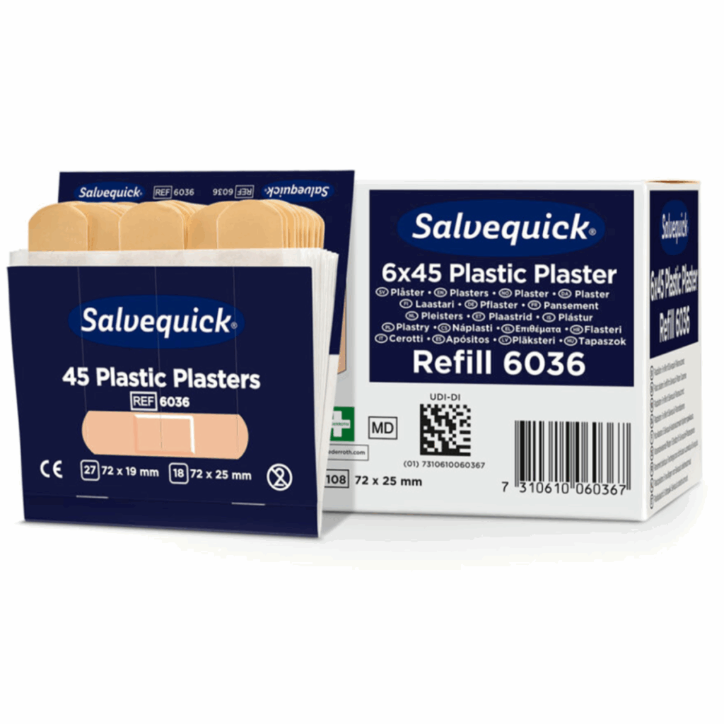 Deze set bevat 6 Salvequick waterafstotende (plastic) pleisternavullingen van telkens 45 stuks voor de pleisterdispenser. In totaal gaat het om 270 plastic pleisters in twee verschillende afmetingen.